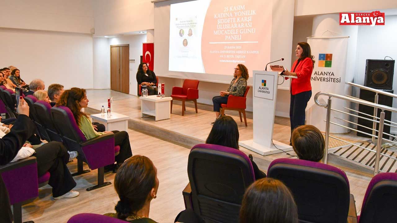 Panele katılan konuklar Kadın Haklarını Koruma Derneği Alanya Şube Başkanı Avukat Melek Depren, Antalya Barosu Alanya Kadın ve Çocuk Hakları Kurulu Başkanı Avukat Gülfer Gözütok ve Antalya Barosu Alanya Kadın ve Çocuk Hakları Kurulu Üyesi Avukat Betül Taştan panelde bilgilerini aktardı. Konuşmacılar kadına yönelik şiddetin türleri, hukuki süreçler, koruyucu ve önleyici mekanizmalar ile toplumsal cinsiyet eşitsizliğinin yarattığı yapısal sorunlara ilişkin kapsamlı değerlendirmeler yaptı. Panelde özellikle Türk Ceza Kanunu, 6284 sayılı Kanun, İstanbul Sözleşmesi’nin oluşturduğu hukuki çerçeve ve şiddetle mücadelenin dayanışma kültürüyle güçleneceği vurgulandı.