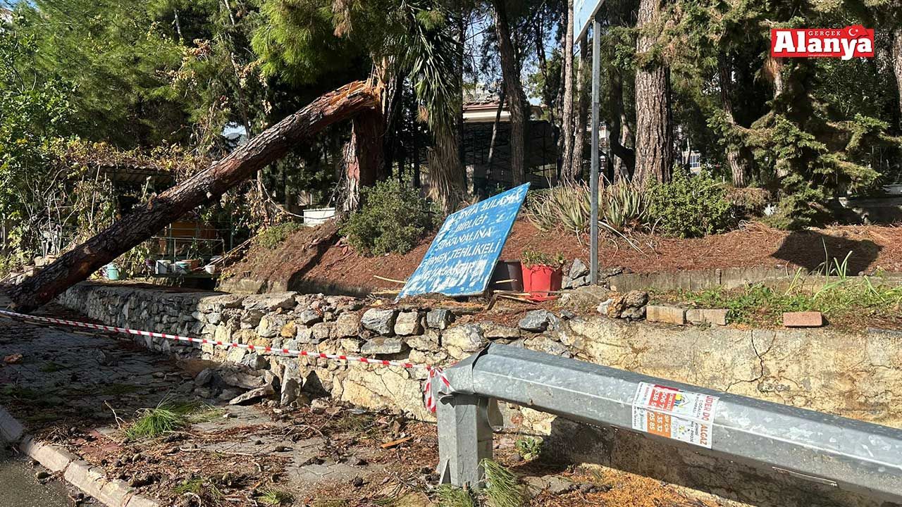 Alanya’da dün akşam saatlerinden itibaren etkili olan yağış ve şiddetli rüzgar Oba Sekilioğlu Mezarlığı içerisinde bulunan ağaç ile aynı mezarlığın önündeki kaldırımda yer alan aydınlatma direğinin devrilmesine neden oldu.