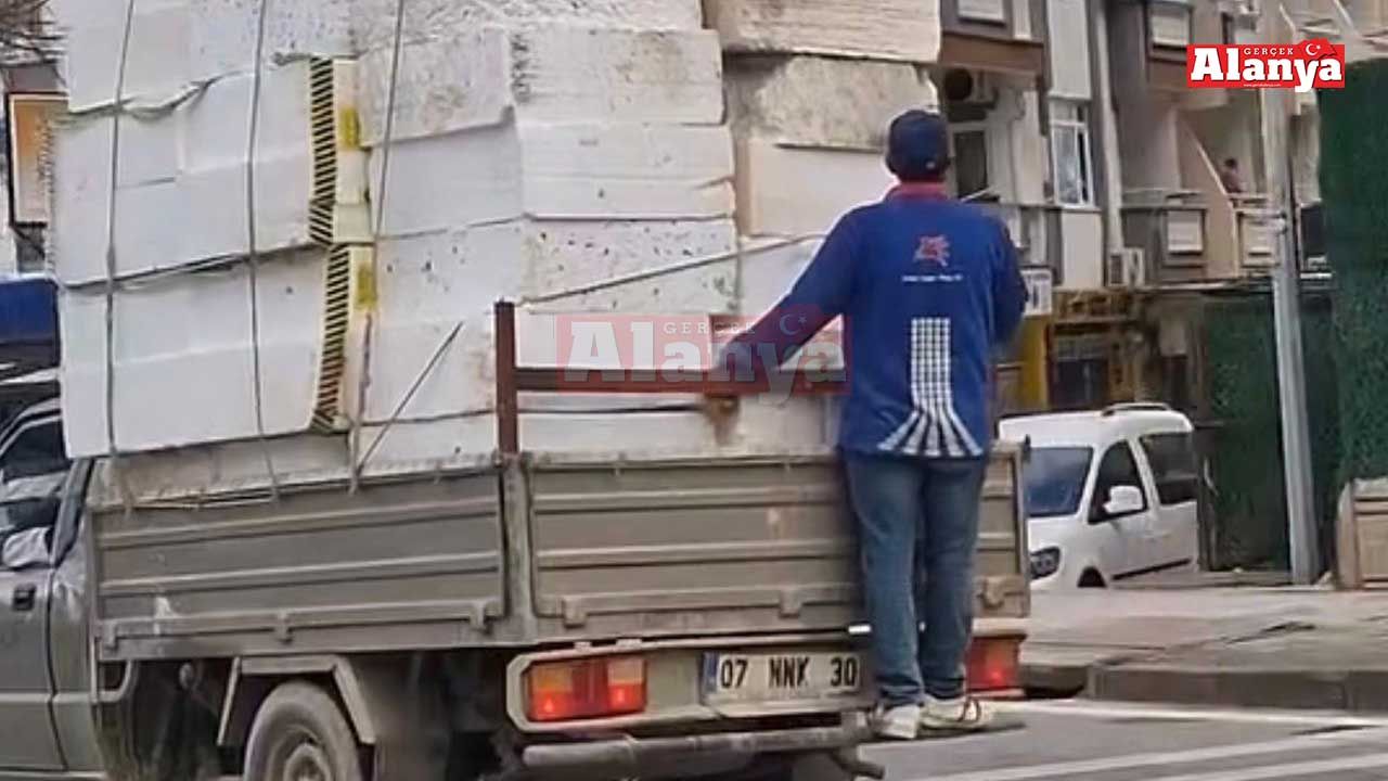 Olay Tosmur Mahallesi’nde meydana geldi. Yolculuk yapan bir otomobil sürücüsü, önünde seyreden kamyonetin arkasına tutunarak giden bir kişiyi görünce, cep telefonu ile o anları kaydetti. Görüntülerde inşaat malzemesi yüklü bir kamyonetin arkasında bir kişinin tutunarak ayakta seyahat ettiği görüldü. Bir süre bu şekilde ilerleyen kamyonet, daha sonra gözlerden kayboldu. Alanya İlçe Emniyet Müdürlüğü’ne bağlı trafik ekipleri, görüntülerin sosyal medya hesaplarından paylaşılması üzerine tespit ettikleri araca ‘trafik güvenliğini tehlikeye sokmaktan’ 3 bin TL cezai işlem uyguladı.