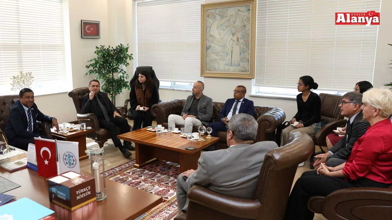 Madagaskar’daki Erasmus KA171 partner kurumlardan biri olan University of Antananarivo’nun Rektörü Prof. Dr. Rivoarison Randrianasolo ve Rektör Yardımcısı Prof. Dr. Tojonirina Andriambinintsoa Ranaivoson, ALKÜ Rektörü Prof. Dr. Kenan Ahmet Türkdoğan’ı ziyaret ederek çeşitli iş birliği konularında temaslarda bulundu. Ziyarette, ALKÜ Rektör Yardımcısı Prof. Dr. Mehmet Kılıç, Dış İlişkiler Genel Koordinatörlüğünden Genel Koordinatör Yardımcısı Öğr. Gör. Gülsiye Bıçak ve KA171 Gelen Hareketlilik Sorumlusu Öğr. Gör. Beril Karanfil, Erasmus KA171 hareketliliği kapsamında daha önce Madagaskar’da bulunmuş olan İşletme Bölümünden Prof. Dr. Mehmet Fatih Güner ile İktisat Bölümünden Prof. Dr. Oğuz Yıldırım, Madagaskar’dan ALKÜ Genetik ve Biyomühendislik Bölümüne gelen Erasmus öğrencileri katıldı. Gerçekleştirilen akademik temaslarda iki üniversite arasında Erasmus Değişim Programı çerçevesinde yürütülebilecek akademik iş birliklerinin yanı sıra turizm, teknoloji ve endemik bitkiler gibi alanlarda ortak proje olanakları değerlendirildi. Görüşmelerin, iki kurum arasında uzun vadeli iş birliklerine güçlü bir zemin oluşturduğu ifade edildi. Ziyaretin, iki kurum arasında akademik ve kültürel iş birliklerini daha da güçlendirilmesi bekleniyor. Heyet, bir hafta süreyle Alanya ve ALKÜ’de bulunarak temaslarını sürdürecek.
