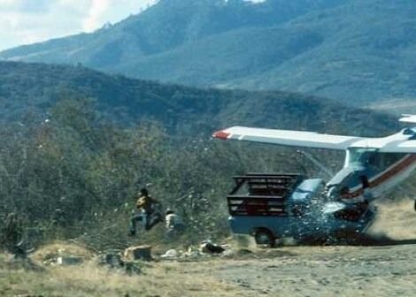 Robert W. Madden tarafından çekilen bu fotoğrafta, yardım götüren bir kurtarma uçağının, iniş sırasında kontrolü kaybederek kamyona çarptığı görülüyor