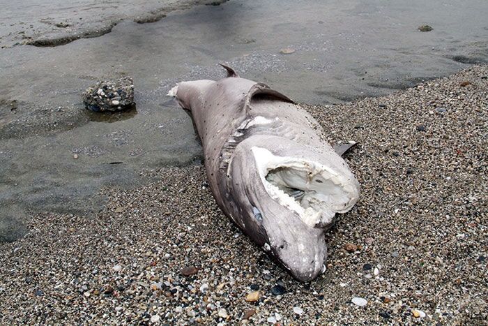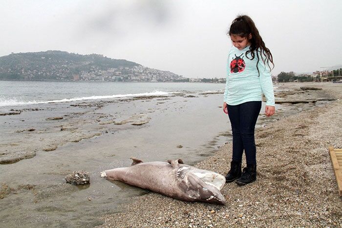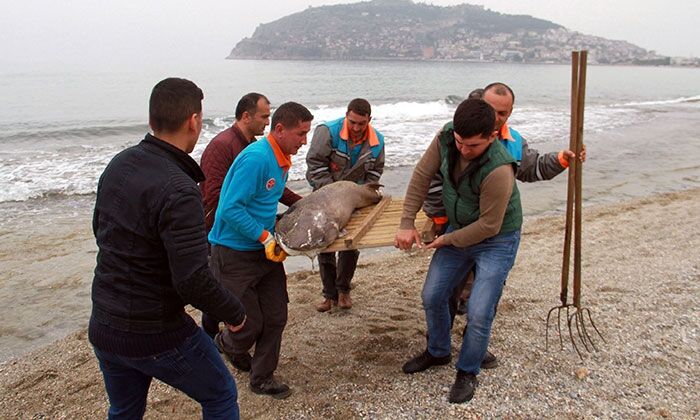 Olay yerine gelen Alanya Belediyesi Temizlik İşleri Müdürlüğü ekipleri, çürümeye yüz tutmuş yaklaşık 2 metre boyundaki köpek balığını tahtadan sedye yaparak güçlükle kamyonete taşıdı.
