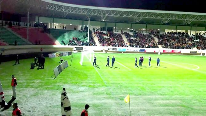 Filelerde sorun! Maçın başlama düdüğü çalmak üzereyken yan hakemin yaptığı kontrollerde Samsunspor’un kalesinde sorun olduğu ortaya çıktı. Saha görevlilerinin müdahalesiyle soru giderildi ve maç başladı.
