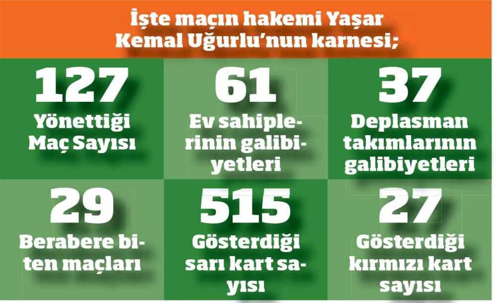 Hakem ev sahibinden yanaMaçın hakemi Yaşar Kemal Uğurlu’nun, bu güne kadar yönettiği maçların %48’ini ev sahibi takım kazandı. Ankara bölgesi üst klasman hakemi olan Yaşar Kemal Uğurlu, genç yaşına rağmen bu güne kadar toplamda 127 maça çıktı. Kartlarını kullanmaktan çekinmeyen 34 yaşındaki Uğurlu, 127 maçta 515 sarı kart göstererek maç başına 4,06’lık bir ortalama yakaladı. Bu maçlarda toplamda 27 tane kırmızı kart gösteren hakem Uğurlu, maç başında 0,21’lik bir ortalamayla düdük çaldı.