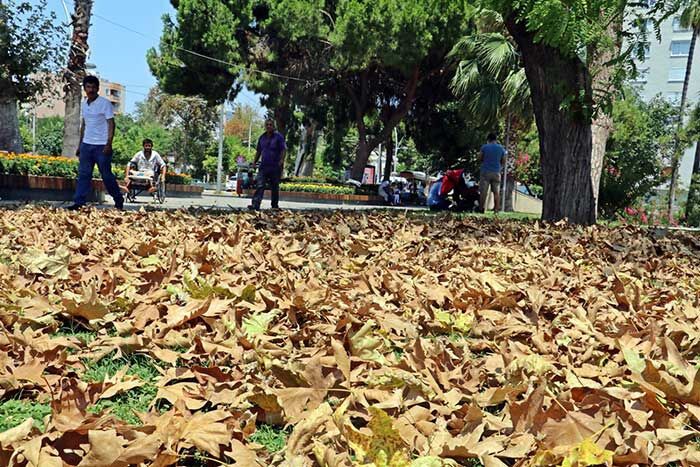 Normalde eylül ayı sonlarında yaprak dökümü gerçekleştiren çınar ağaçları, temmuz ayı başında adeta kurudu. Yaz ve sonbaharın iç içe girdiği kentte binlerce yaprağı yerde gören vatandaşlar da şaşkınlıklarını gizleyemedi.