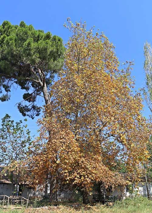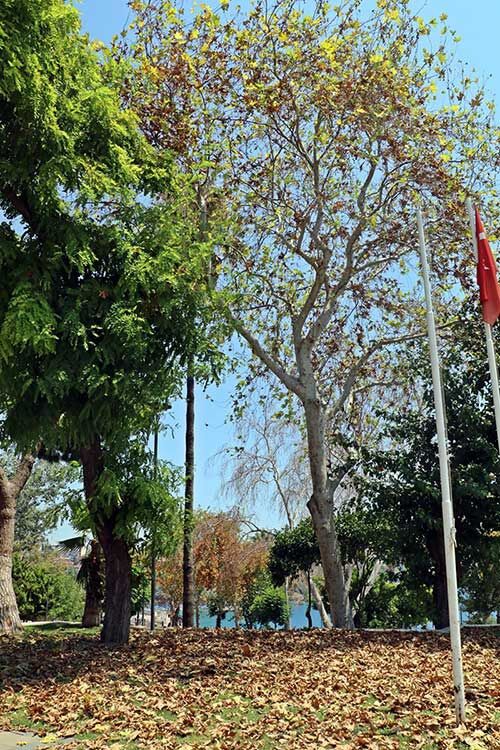 Uzmanlarsa, kış aylarında az yağış gerçekleştiğini ve buna bağlı olarak aşırı sıcakla birlikte çınarların topraktan yeterli suyu temin edemeyip yapraklarını döktüğünü kaydetti.