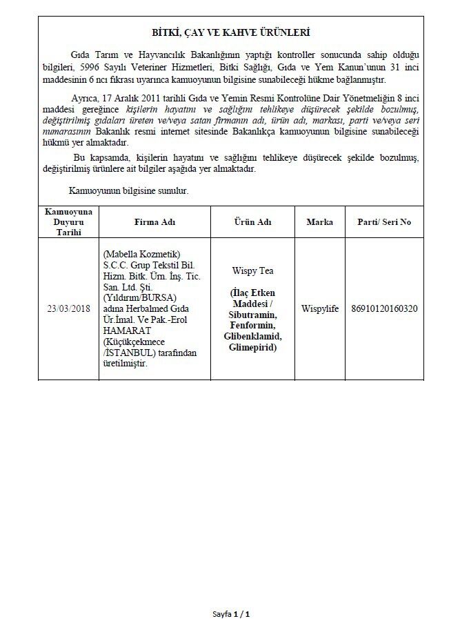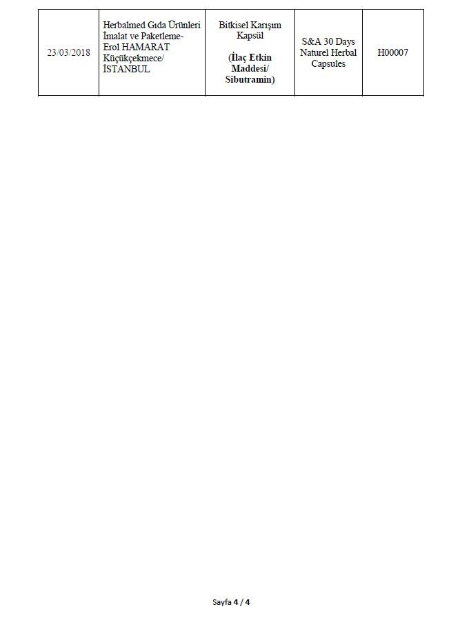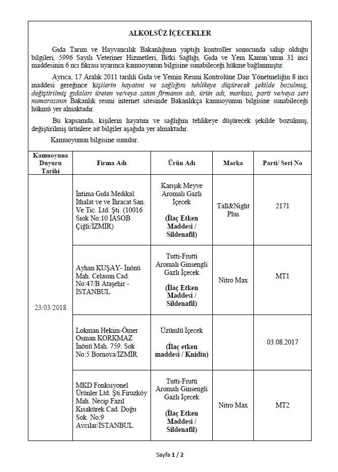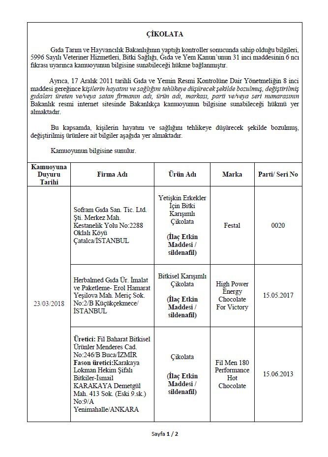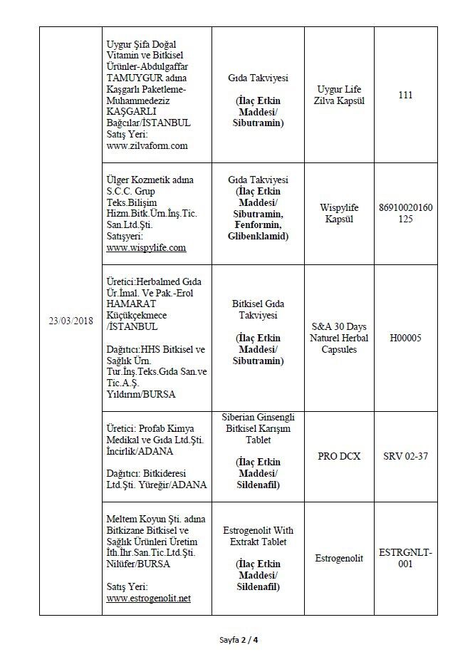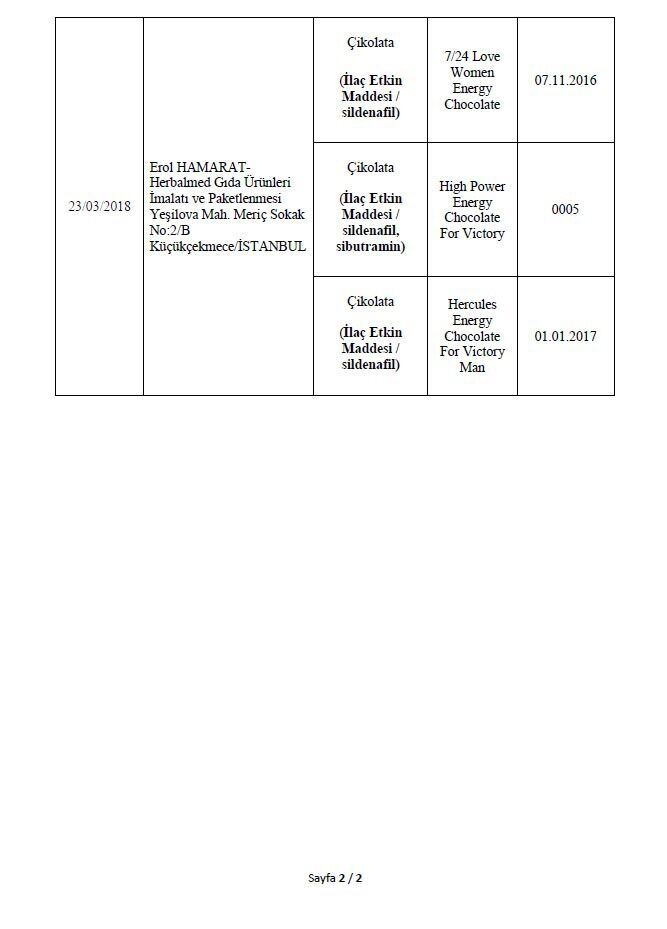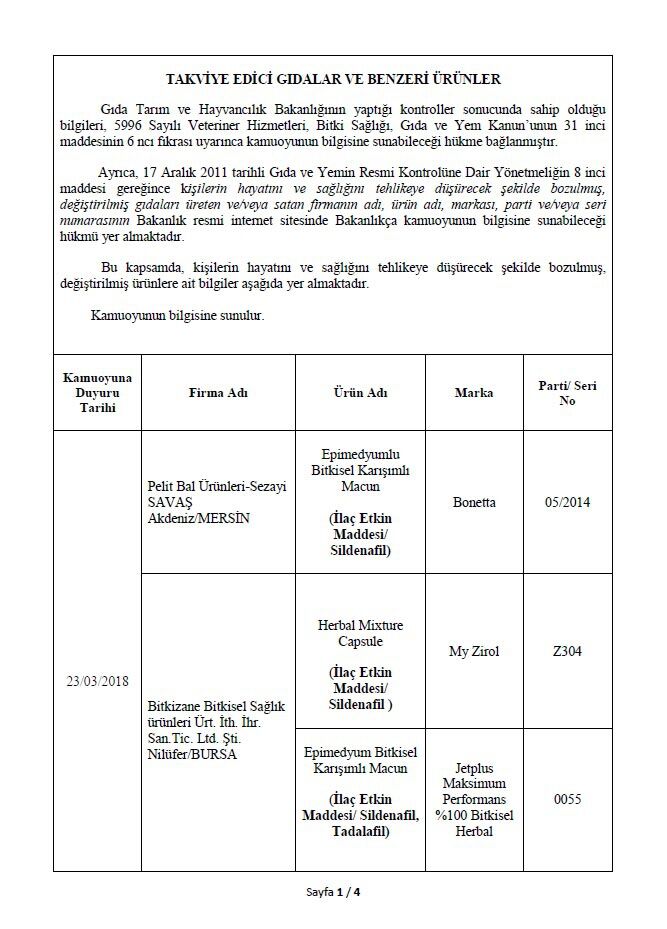 Duyuruda, takviye edici gıdalarda da değiştirilmiş 15 ürüne ait bilgiler yer aldı. Bitkisel macun ve bitkisel gıda takviyelerinde sıklıkla ilaç etkin maddesi "sildenafil"e rastlandığı bildirildi.