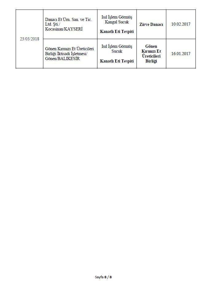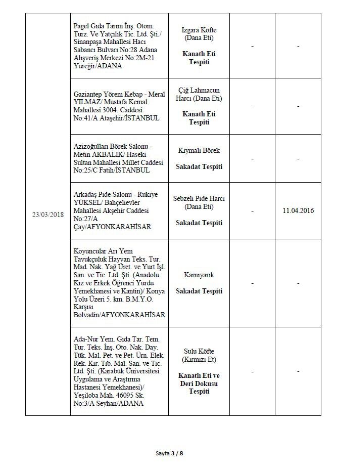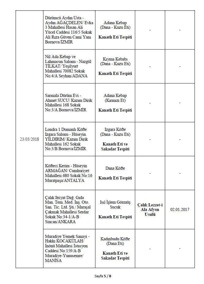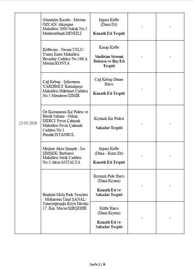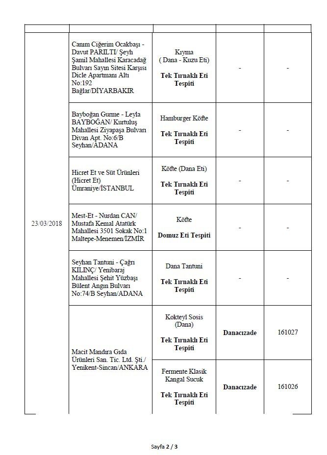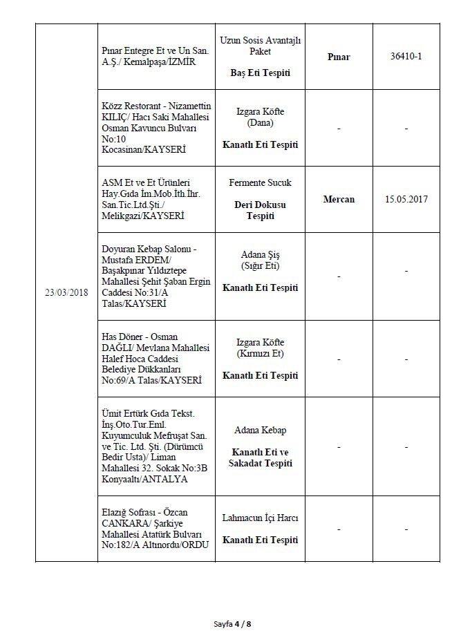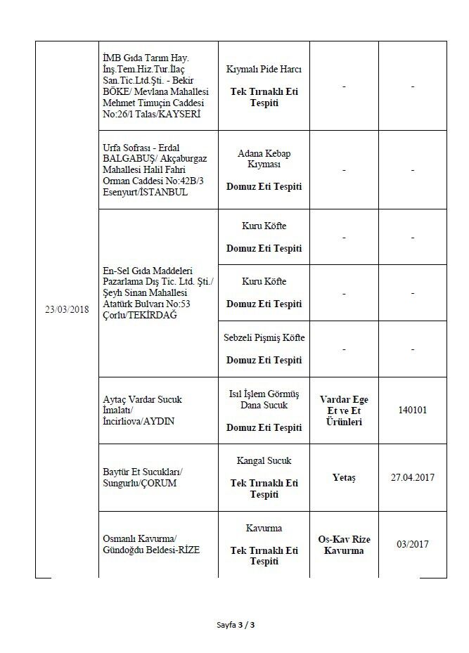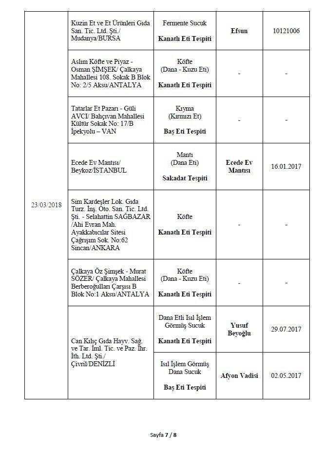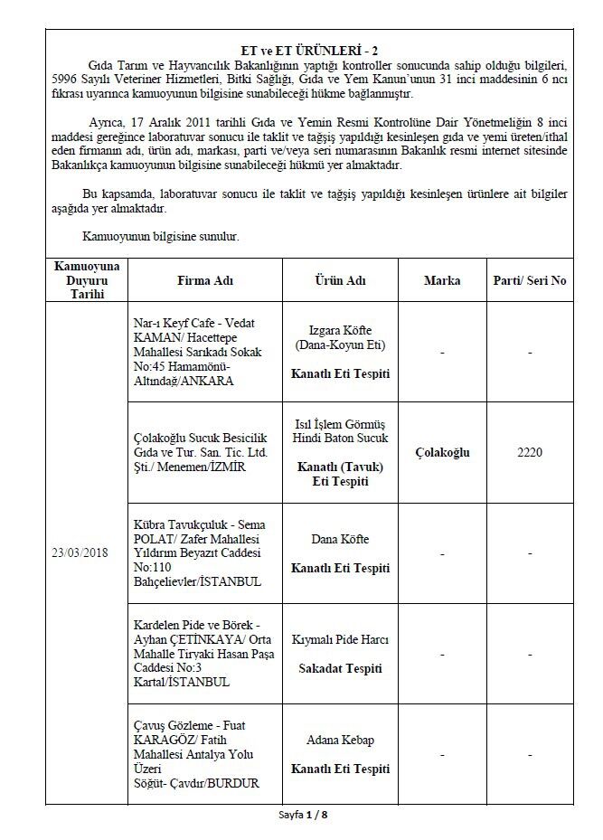 Et ve et ürünlerinde de laboratuvar tahlilleri sonucunda taklit ve tağşiş yapıldığı kesinleşen, sucuk, köfte, kebap, sulu köfte, karnıyarık, kıymalı börek, lahmacun, pide harcı ve döner ürünlerinin aralarında bulunduğu 70 parti ürüne ait bilgiler açıklanırken, içinde kırmızı et olduğu belirtilen ürünlerin çoğunda kanatlı eti tespit edildiği, özellikle pide ve yemek harçlarında sakatat, deri, baş eti gibi tağşişlere rastlandığı ifade edildi.