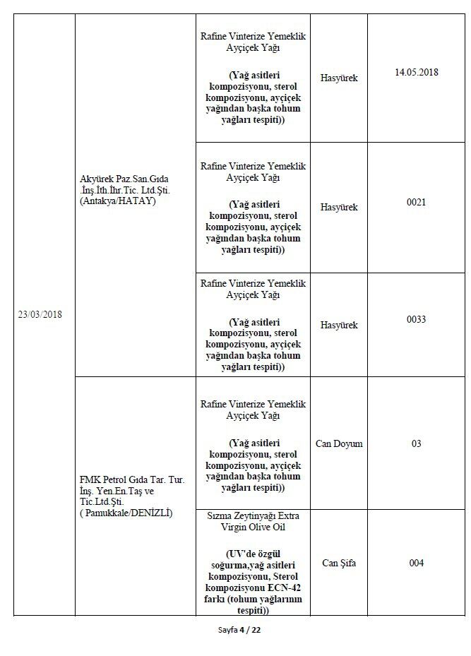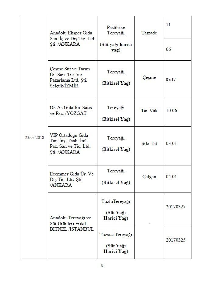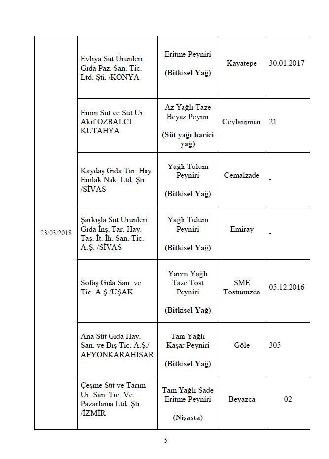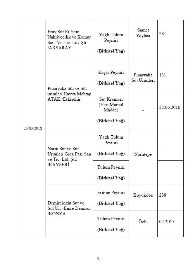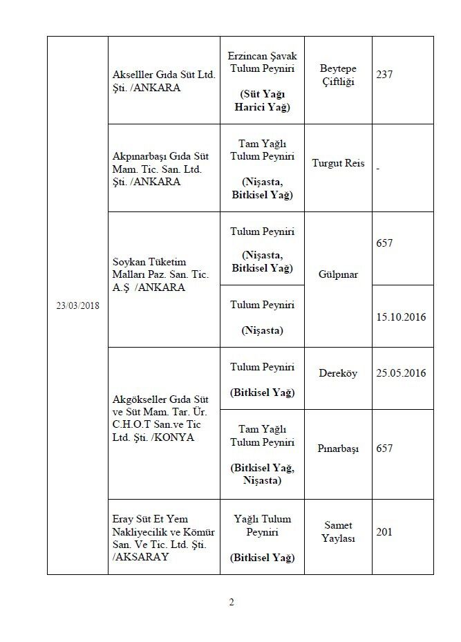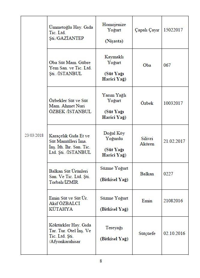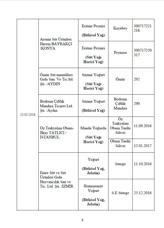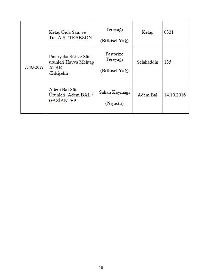 Gıda ve Kontrol Genel Müdürlüğünün internet sitesinde yer alan duyuruda, kontroller sonucunda süt ve süt ürünlerinde taklit ve tağşiş yapıldığı kesinleşen yoğurt, peynir, tereyağı, kaymak başta olmak üzere 64 parti ürüne ait bilgiler kamuoyu ile paylaşıldı. Süt ürünlerinde bitkisel yağ, jelatin, nişasta tespit edildiği belirtildi.