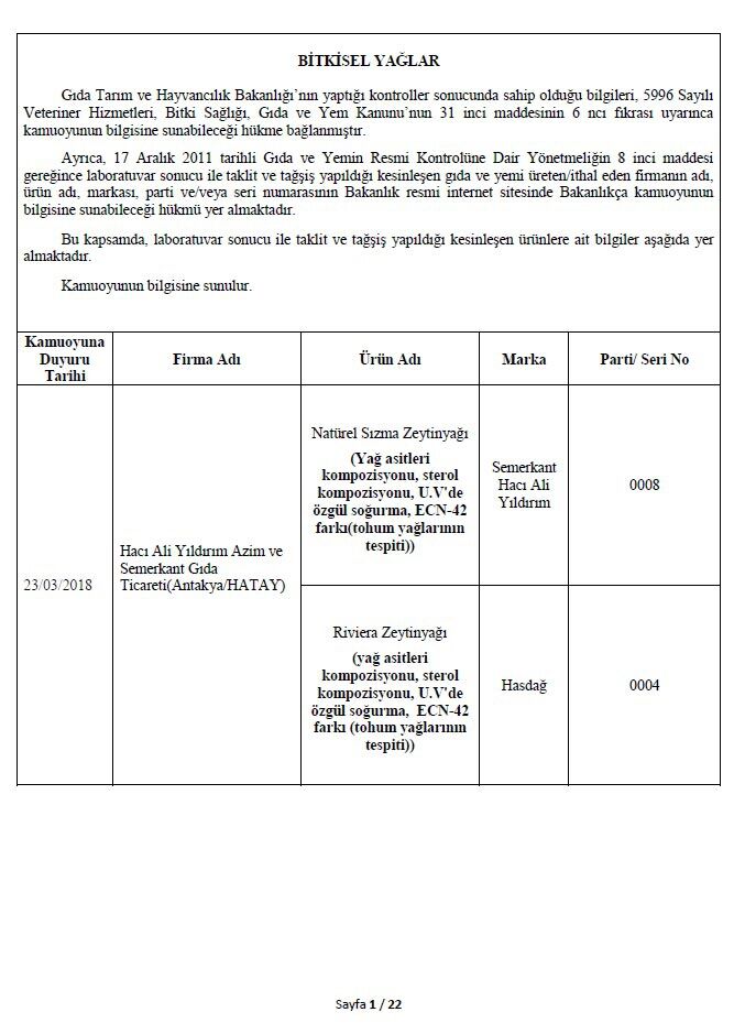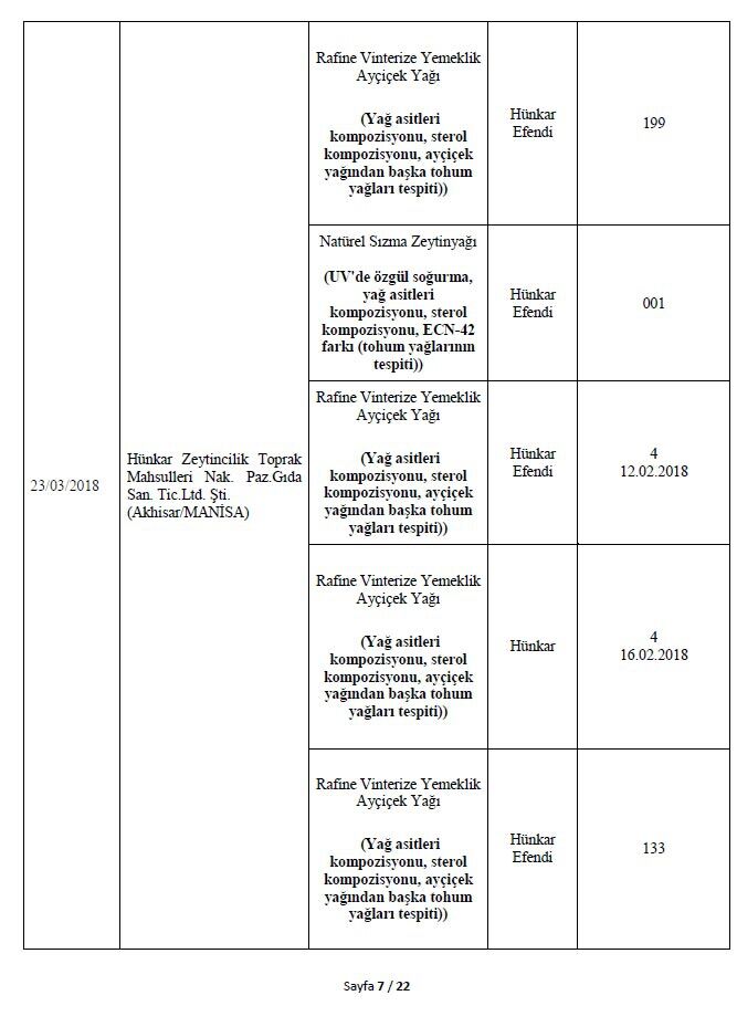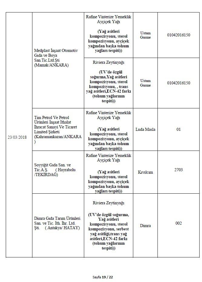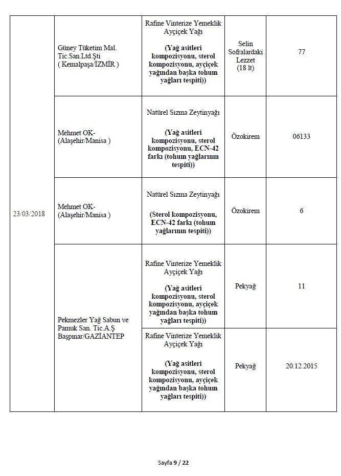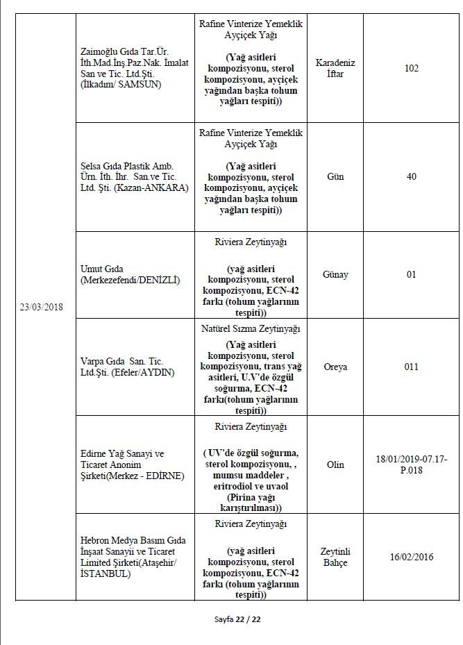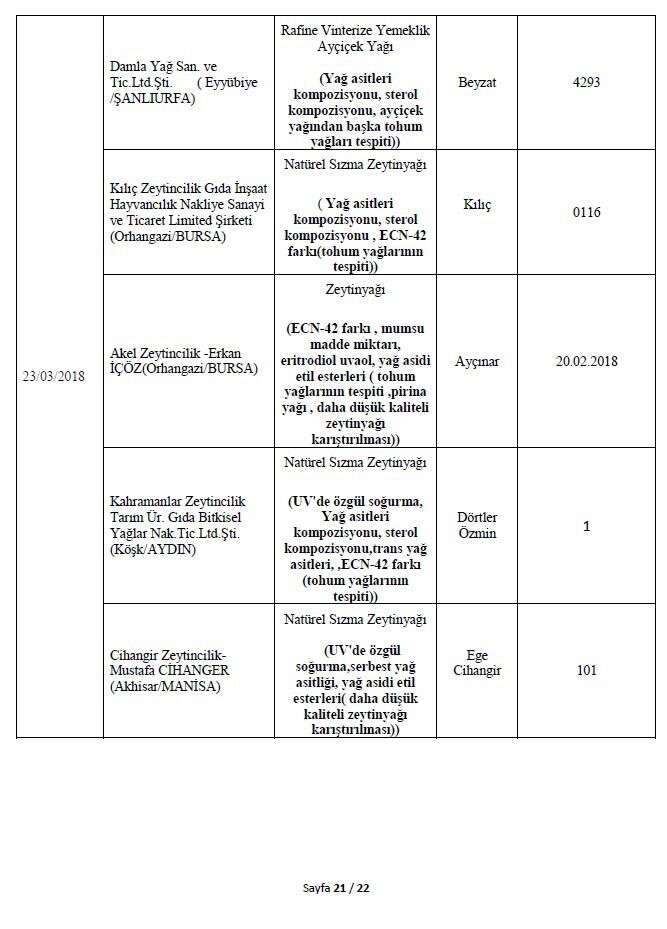 Gıda, Tarım ve Hayvancılık Bakanlığı, et ve süt ürünleri, takviye edici gıdalar ve benzer ürünler, bitkisel yağlar, bal, alkolsüz içecekler, baharat, çikolata, enerji içeceği üretiminde taklit ve tağşiş yapan işletmeler ve ürünlerini kamuoyuna ilan etti.