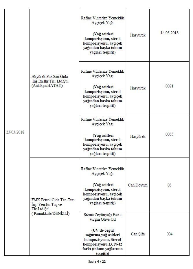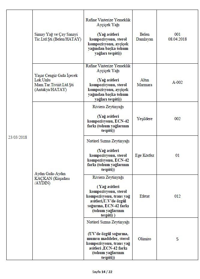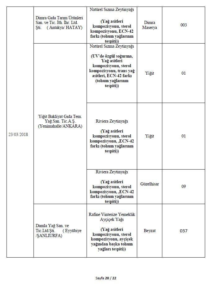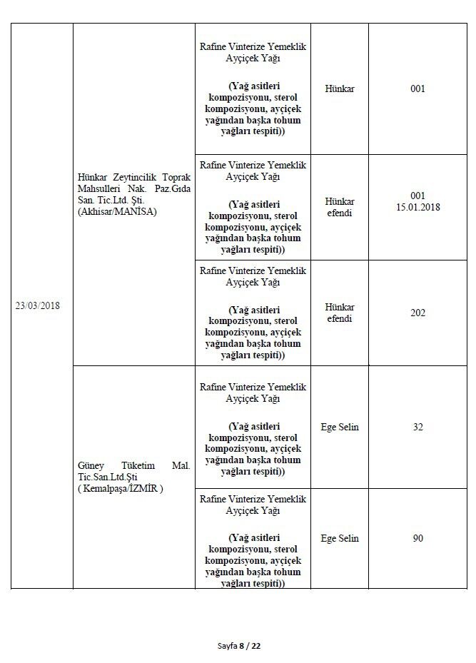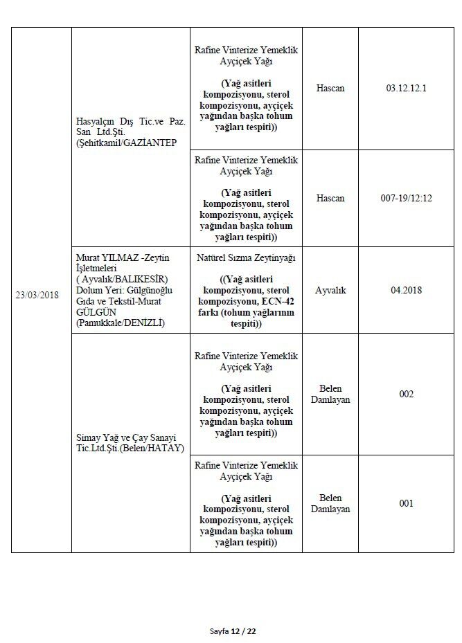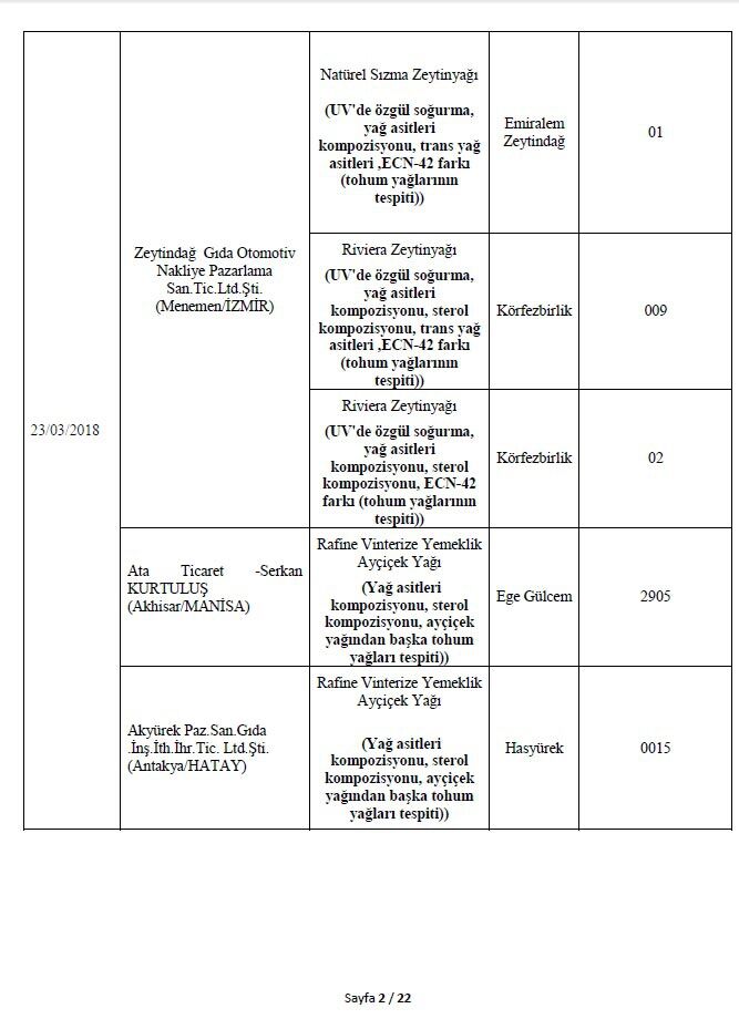 Gıda, Tarım ve Hayvancılık Bakanlığı, et ve süt ürünleri, takviye edici gıdalar ve benzer ürünler, bitkisel yağlar, bal, alkolsüz içecekler, baharat, çikolata, enerji içeceği üretiminde taklit ve tağşiş yapan işletmeler ve ürünlerini kamuoyuna ilan etti.