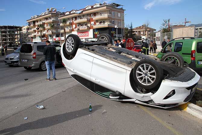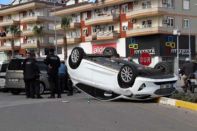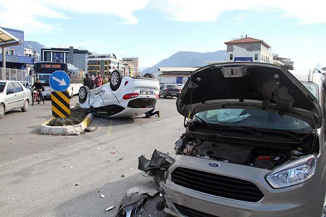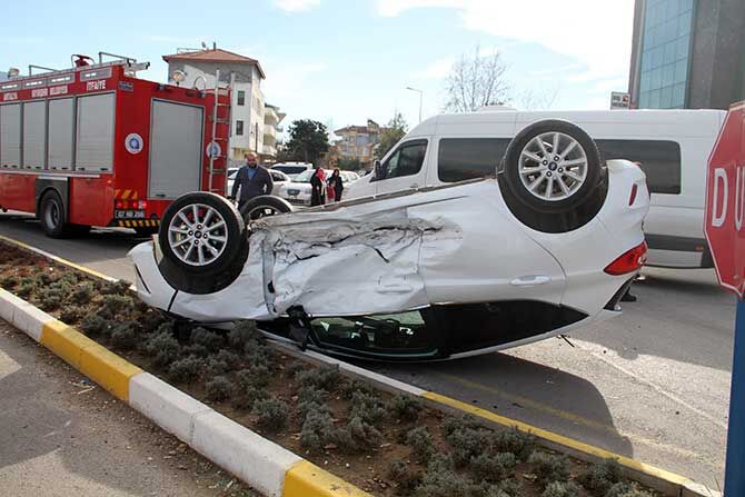 Çarpışmanın şiddetiyle kontrolden çıkan 07 NMC 34 plakalı araç refüje çarptıktan sonra takla atarak ters döndü.