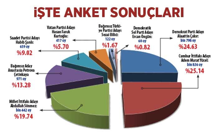 Millet ittifakı Adayı Abdullah Sönmez ise, üçüncü sırada yer aldı. Anket sonuçlarında Alaattin Çakır, Abdullah Sönmez’e yüzde 4 civarında fark attı.