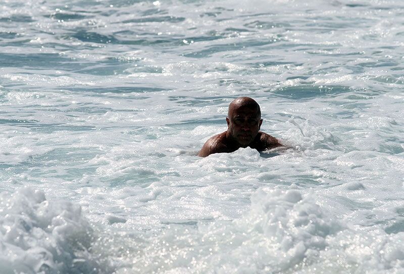 Güneş banyosunun ardından kendilerini mavi sulara atan turistler, bol bol yüzdü.
