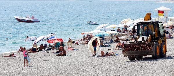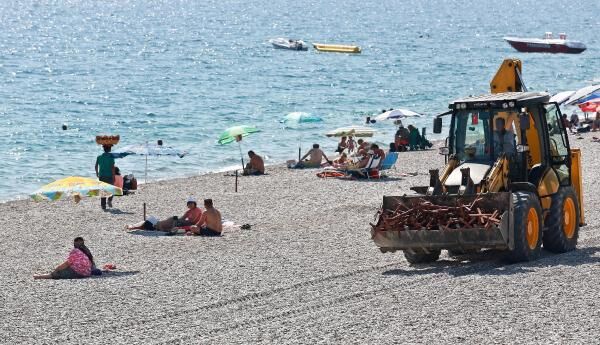 Güneş şemsiyelerinin takıldığı demir aparatların yanı sıra ahşap şezlonglar ise iş makinelerinin yardımıyla traktör ve kamyonetlere yüklenerek taşınıyor.