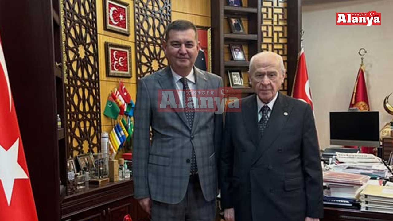 MHP Alanya önceki dönem İlçe Başkanı Mustafa Türkdoğan, Ankara’ya giderek partisinin Genel Başkanı Devlet Bahçeli’yi makamında ziyaret etti. Geçtiğimiz aylardaki ziyaretinin ardından tekrar Ankara’ya giden Türkdoğan, partisinin genel merkezinde MHP Genel Başkanı Devlet Bahçeli’yi ziyaret etti. Bahçeli'den Alanya halkına selamlarını alan Türkdoğan, “Türk Dünyasının Bilge Lideri Genel Başkanımız Sayın Devlet Bahçeli Beyefendi’yi ziyaret ederek hayır dualarını, emir ve talimatlarını aldım. Cenab-ı Allah Liderimizi başımızdan eksik etmesin. Ömrü uzun olsun” dedi.