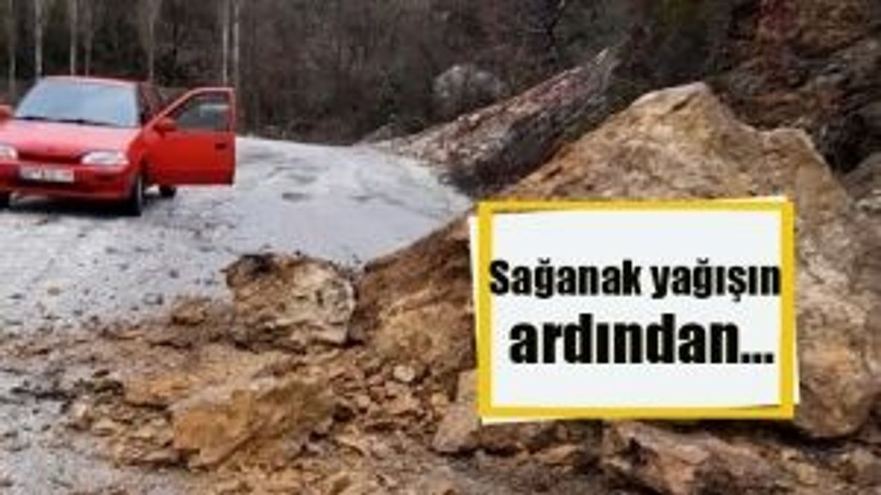 Alanya’da etkili olan sağanak yağışın ardından yamaçta bulunan kaya parçası koparak yola yuvarlandı.