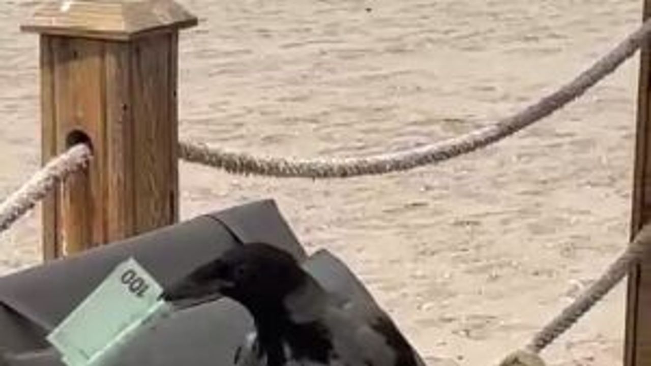 Serik'te bir otelin sahilindeki karganın, turistlerin çantasından para çalma anı cep telefonu ile kaydedildi. - İHA