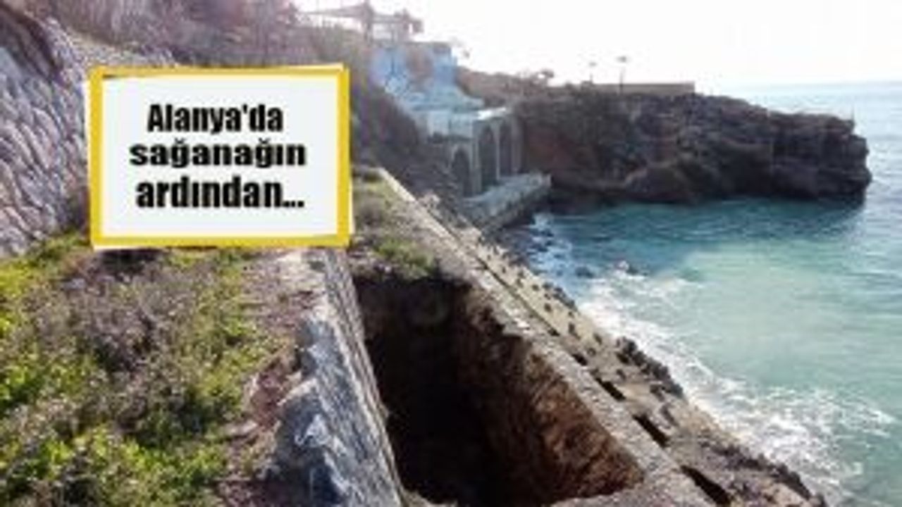 Alanya'da birkaç gün önce etkili olan sağanak yağışın ardından Ulaş Dinlenme Parkı'nda göçük meydana geldi. Parkın denize bakan tarafındaki 3 bölümde yer alan toprak tabakası göçtü. Göçük sırasında her 3 bölümde bulunan taş duvarlar ise yıkılmadı. - Erkan Uysal